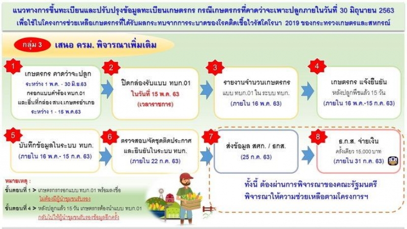 เกษตรกรกลุ่มที่ 3 สามารถยื่นแบบคำร้องขอขึ้นทะเบียนและปรับปรุงทะเบียนเกษตรกรที่คาดว่าจะทำการเพาะปลูกไว้ก่อน โดยส่งแบบคำร้องขอขึ้นทะเบียนเกษตรกรได้ที่สำนักงานเกษตรอำเภอที่คาดว่าจะทำการเพาะปลูกไว้ก่อน โดยส่งแบบคำร้องขอขึ้นทะเบียนเกษตรกรได้ที่สำนักงานเกษตรอำเภอ หรือผ่าน อกม. หรือ ผู้นำชุมชนได้ ภายใน 15 พ.ค. 63 เท่านั้น เมื่อเกษตรกรได้ปลูกพืชแล้วไม่น้อยกว่า 15 วัน หรือ ก่อน 30 มิ.ย. 63 ให้มาแจ้งยืนยันว่าได้ทำการเพาะปลูกแล้วกับเจ้าหน้าที่ เพื่อบันทึก และตรวจสอบตามหลักเกณฑ์เงื่อนไขการขึ้นทะเบียนและปรับปรุงทะเบียนเกษตรกรให้แล้วเสร็จ และจะสรุปรายงานเสนอคณะรัฐมนตรี เพิ่มเติม เป็นกลุ่มเป้าหมายที่ 3 ในโครงการช่วยเหลือเกษตรกรกรณีที่ได้รับผลกระทบจากการco vid19 ของกระทรวงเกษตรและสหกรณ์ต่อไป
